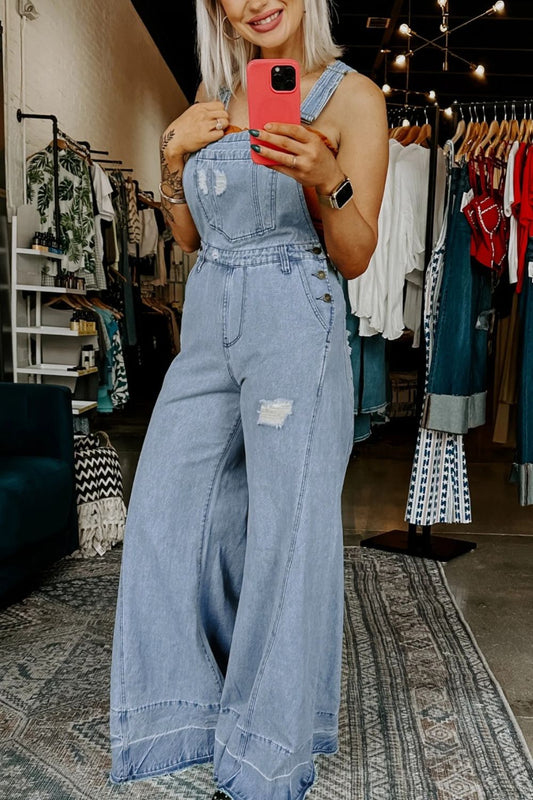 Distressed Wide Leg Denim Overalls